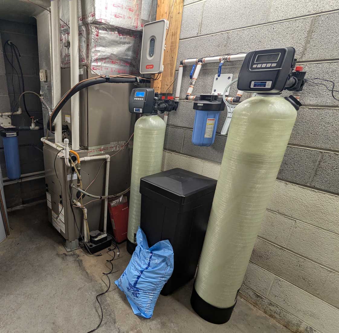 We recently designed and installed a customized water treatment system for a customer who previously had a sediment filter only. They had been changing the filter every month or two, so we were aware of their sediment load. After testing the water for free in our Asheville office, we discovered the water had a low pH, a very small amount of iron, and hardness (calcium and magnesium).